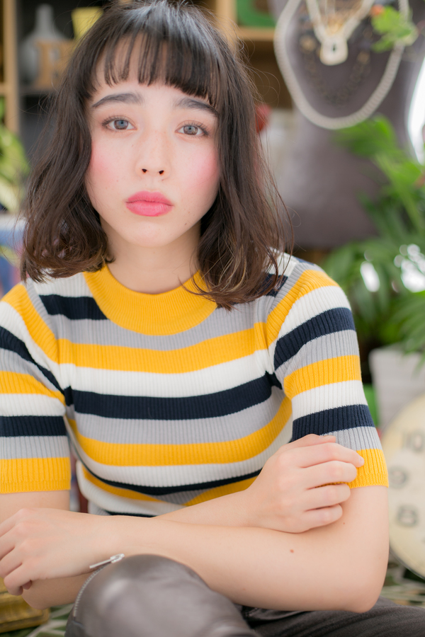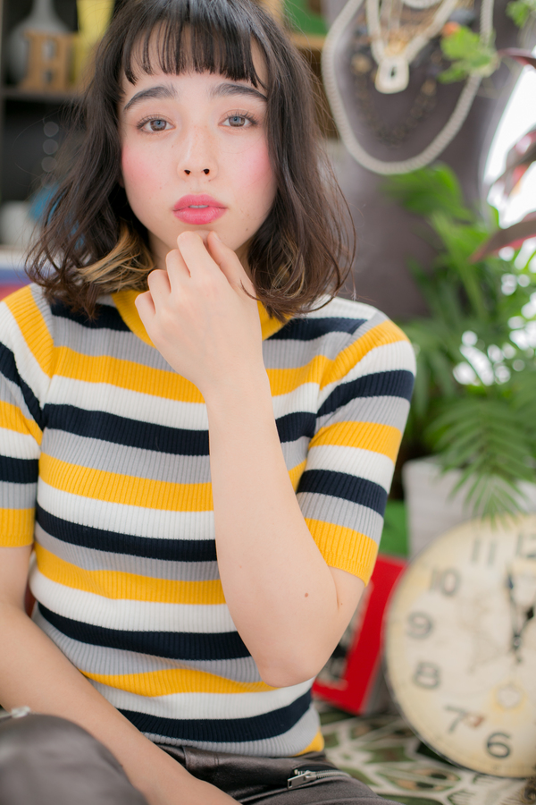 ニュアンスカールと透け感あるショートバングがカワイイガーリーミディ。毛先にハイライトを入れることで、個性的でオシャレ度UP!奥行き感も出て表情豊かに仕上がります。周囲と差をつけたい方にオススメですよ。