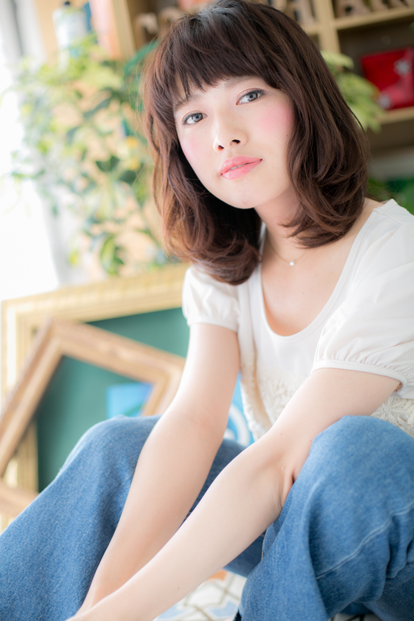 ナチュラルミディの毛先に、程良く上品なエアリーカールをプラス。作りこみない雰囲気で女性らしいやわらかさとラフさを残して。黒髪やネイビーブラックの暗髪でも重めスタイルになりません。耳かけも大人かわいい♪