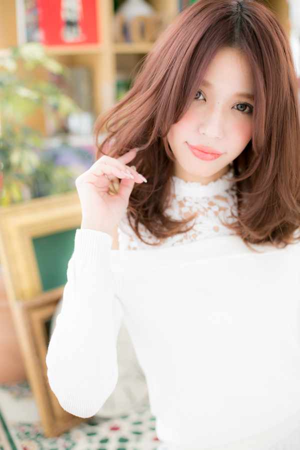 レッド系カラーとセンターパートで個性的に仕上げたグラマラスセミディなヘアスタイル。ノーバングでスッキリと、前下がりの毛流れで輪郭カバーして小顔にメイクで大人女子のファション度UP☆。斜めバングや厚めバングもフェミニンでヘアアレンジ☆トリートメントしたようなカラーリングで髪の悩みも解決する人気のカラーやピンク系のもおすすめ!30代・40代にも◎(メイク担当:北浦和店 棟方)