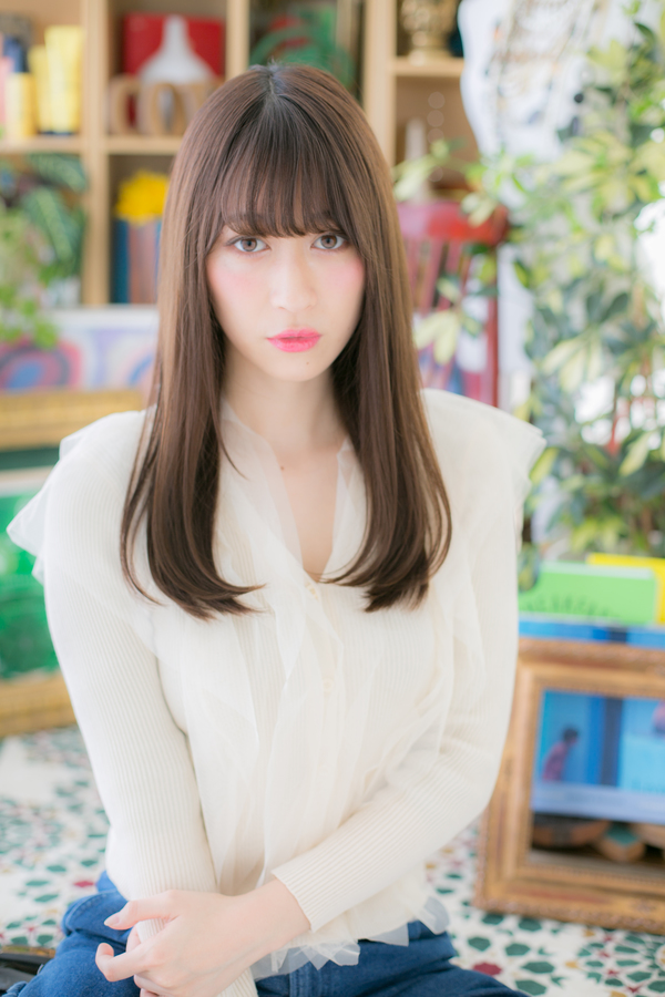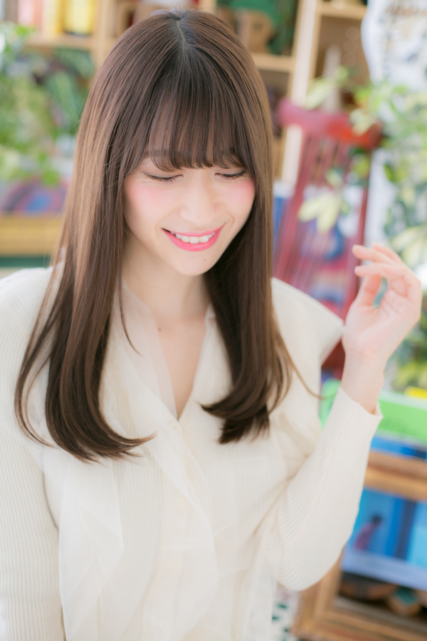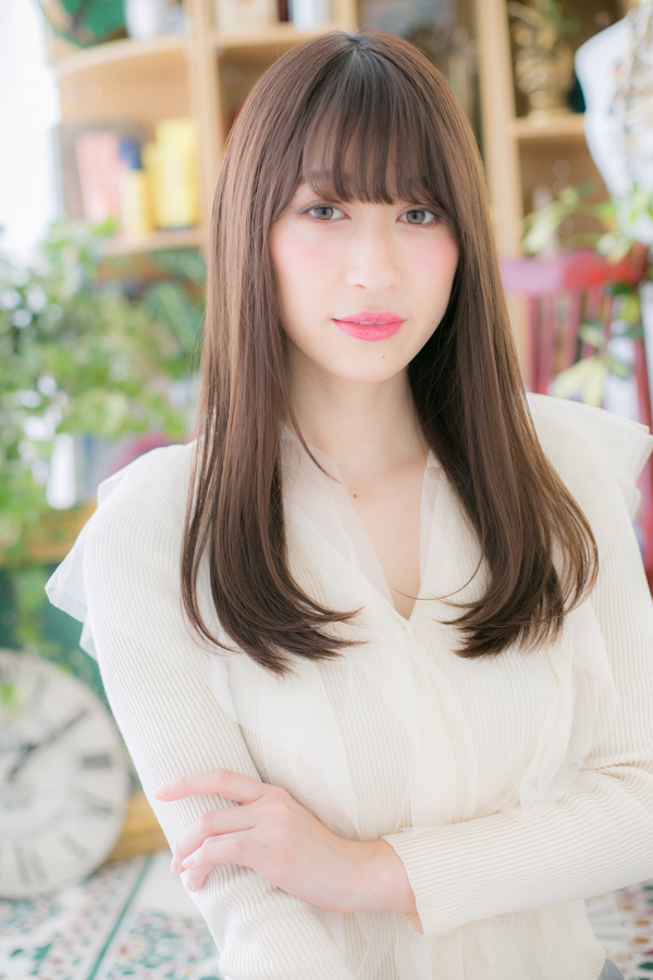 うっとりするほどツヤと透明感の光る黒髪ストレートで大人かわいい雰囲気なヘアスタイル。前下がりで輪郭カバーして小顔にしたり、耳かけでフェミニンしてヘアアレンジ◎斜めバングや厚めバング、オン眉も旬顔で大人女子のファション度UP!トリートメントしたようなカラーリングや髪の毛の悩みも解決!30代・40代にもおすすめ!(メイク担当:川口店 成田)