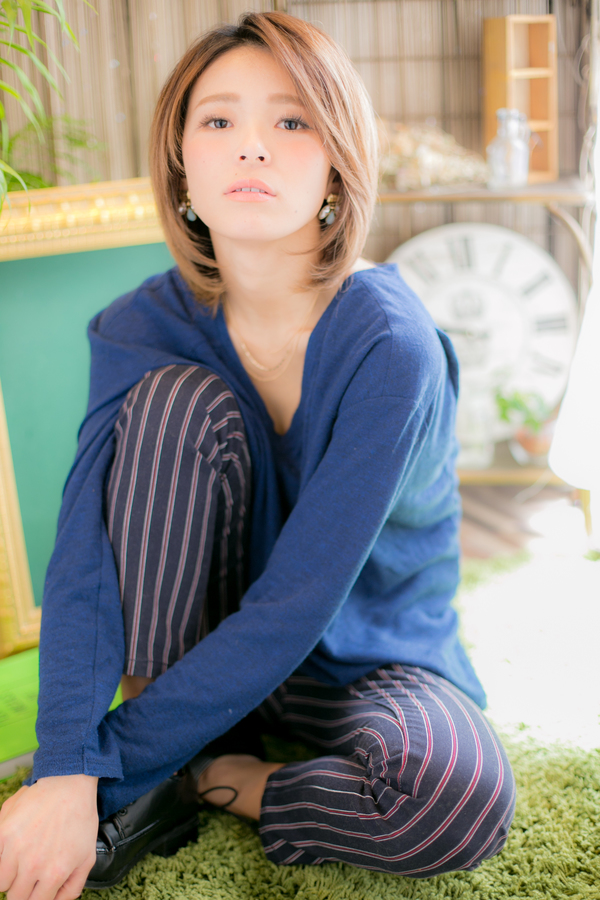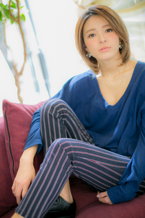 伸ばしかけの方だけでなく、ショートにしたいけど勇気のない方にもオススメ!のフェミニンなワンカールミディ。ハイトーンxツヤ感で、重めスタイルの中にも軽さを演出。トーンダウンや暗髪・黒髪にすればオフィスでも好感度大!センターパートや耳かけもGOOD!!