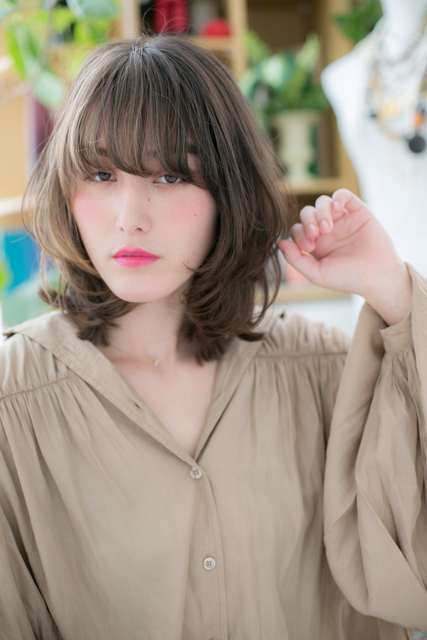 長めにセットした斜めバングで目力UPのヘアスタイル。抜け感ラフミディは前下がりで小顔に見せて大人女子のコーデを完成。耳かけや厚めバングも大人かわいいヘアアレンジ。ミディアムヘアが際立たせるグラデーションやベージュで髪の毛の悩みも解決!30代・40代にもおすすめ!(メイク担当:川口店 成田)