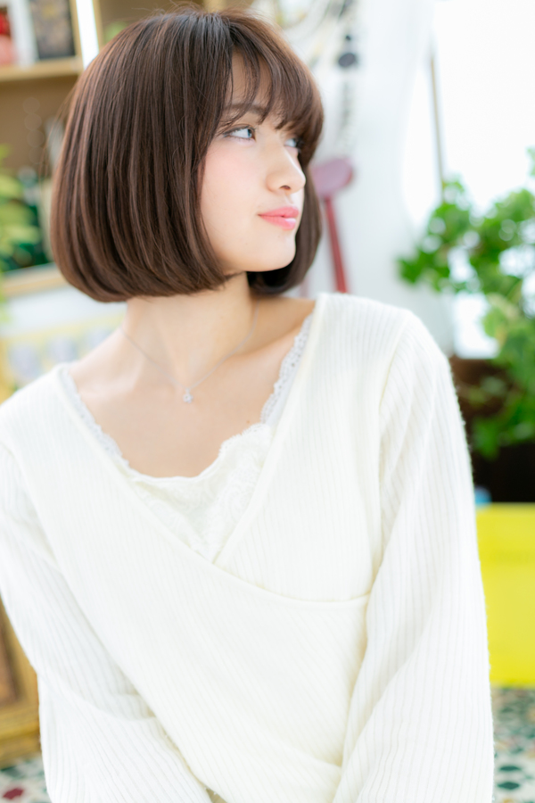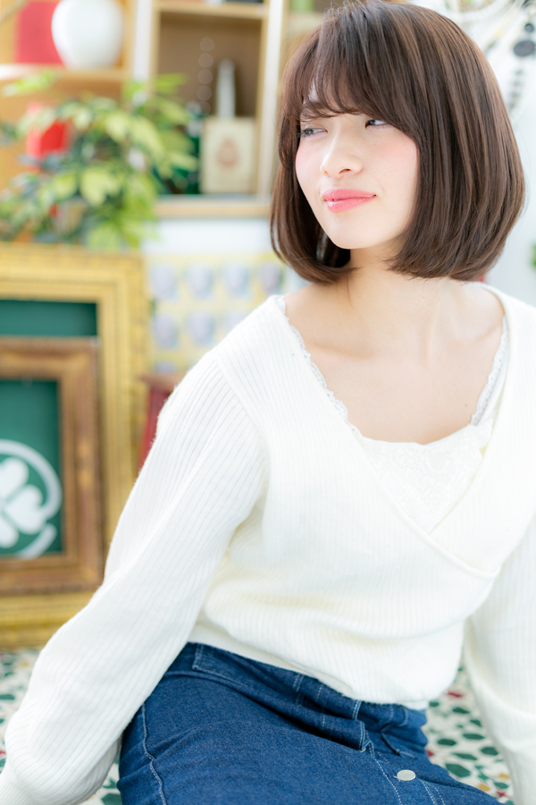 シンプルなナチュラルボブは透明感がポイント。黒髪のツヤ感で重めスタイルを軽やかモード風にして大人女子のコーデを完成。ミディアムヘアを際だたせるグラデーションやベージュな暗めの髪の色もおすすめ!30代の抜け毛の悩みもご相談ください。(メイク担当:北浦和店 棟方)