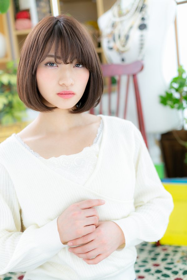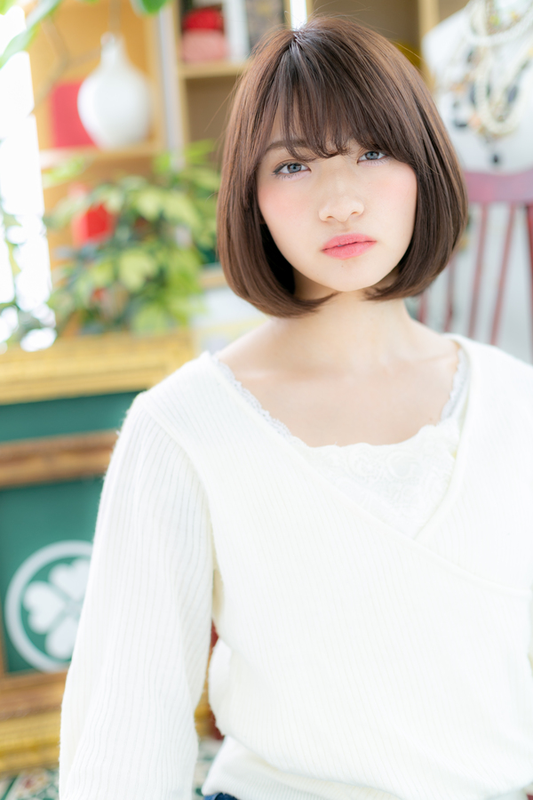 シンプルなナチュラルボブは透明感がポイント。黒髪のツヤ感で重めスタイルを軽やかモード風にして大人女子のコーデを完成。ミディアムヘアを際だたせるグラデーションやベージュな暗めの髪の色もおすすめ!30代の抜け毛の悩みもご相談ください。(メイク担当:北浦和店 棟方)
