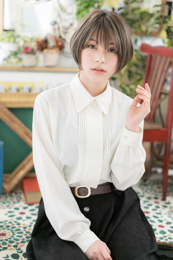 小顔見せ効果大のショートのヘアスタイル。目の上ギリギリのシースルーバングでトレンド感と目力UPで大人女子のファッション度UP!髪の毛の悩みを解決する人気のカラーやアッシュグレー、グレージュ。ブリーチなしもおすすめ!40代にも人気!(メイク担当:北浦和店 棟方)