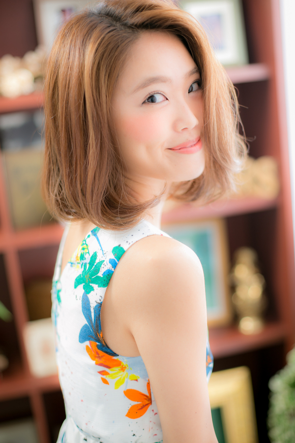 ナチュラルな斜めに分けたバングで無造作なエロティックロブスタイルは大人っぽい女らしい印象に。毛先を調節してカールの動きが出やすいようにしてあります。