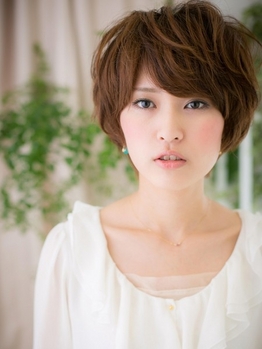 パーマのふんわりとした質感が可愛い、リラックスショート。前髪にほんの少し分け目を作ることで、小顔対策もばっちり。大人っぽさもある可愛いショートをお探しの方、ぜひ!