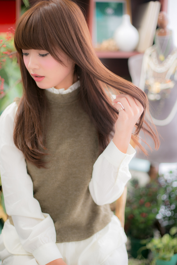 思わずため息が出てしまうくらい綺麗にツヤめく、しっとりまとまった美髪ストレート。低い位置に入れたレイヤーで軽さを出し、目の上ギリギリのパッツンバングで少女らしさを出すことで、オトナっぽくなり過ぎないガーリー乙女ロングに。パッと華やぎます!