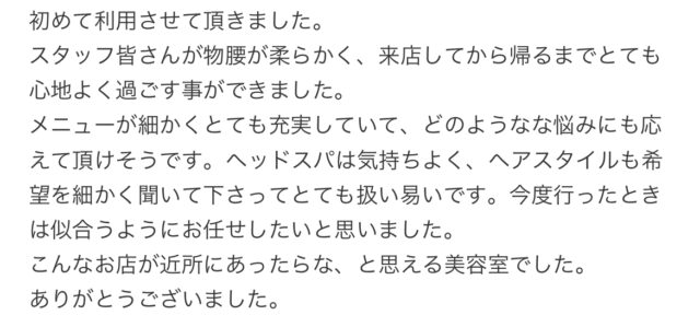 接客や技術についてのお褒めの言葉をいただき、大変嬉しく思います!