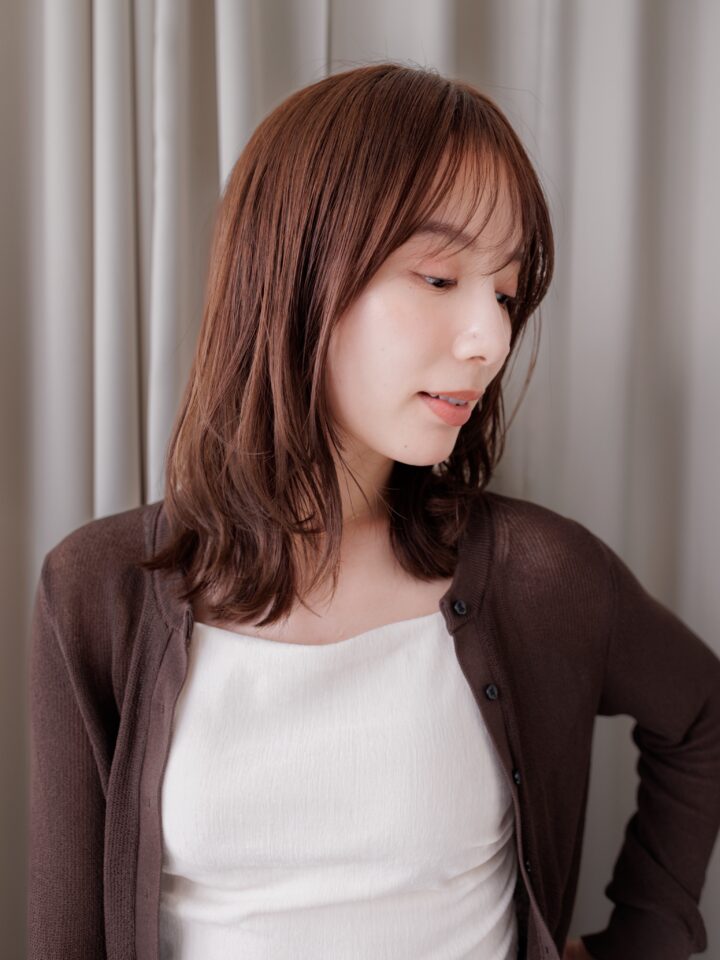 小顔カット。やりすぎない自然なエアリーな質感が、どこか余裕のある女性らしい可愛らしさを表現。ON.OFFどちらもいけて、カジュアルな中にもキチッと感のある万能ヘアをぜひ!