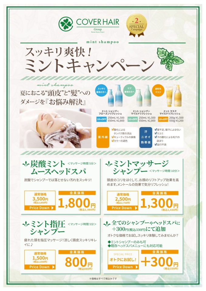 8月も、スッキリ爽快ミントシャンプー&スパメニュー続行します。