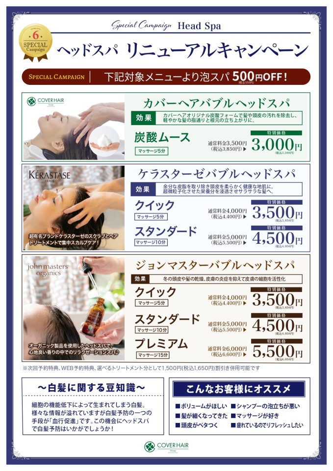 カバーヘアには、極上ヘッドスパが豊富に揃っております♪