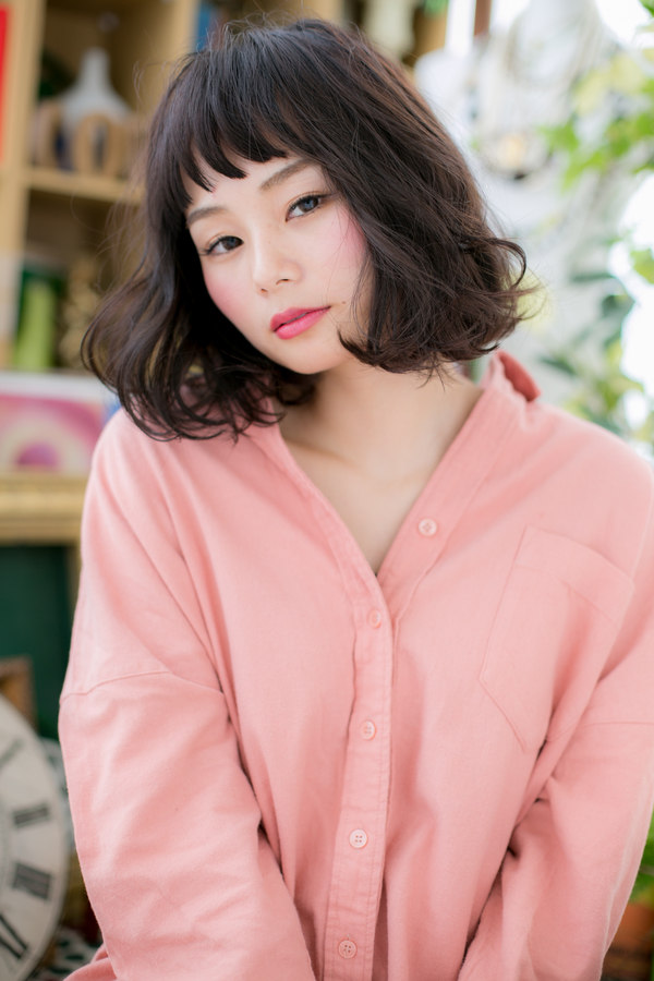 ショートバングとくせ毛風のゆるカールでカジュアルに仕上げたふわミディのヘアスタイル。黒髪でも重めスタイルにならず、ラブガーリーな印象にヘアアレンジし大人女子のコーデを完成!。ミディアムヘアを際立たせるグラデーションでトリートメントしたようなカラーリングで髪の毛の悩みも解決!人気のカラーやピンク系のカラーも◎30代・40代にもおすすめ!