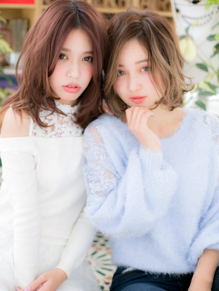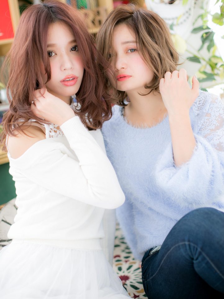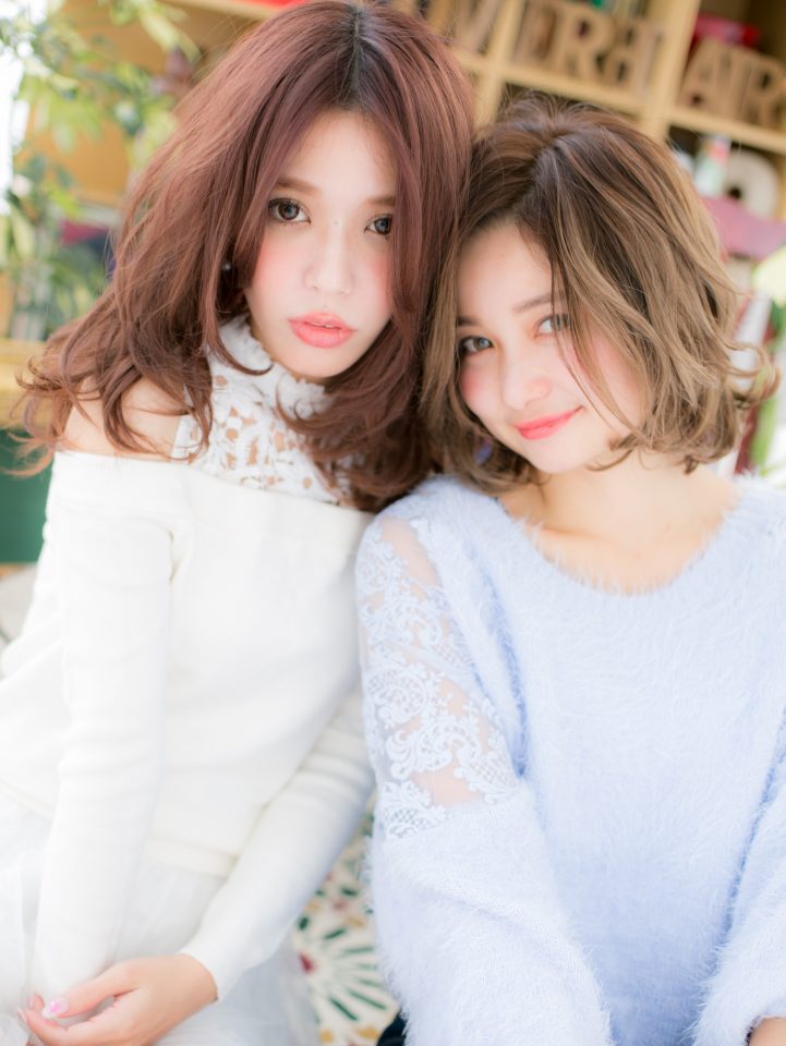 左:センターパートで輪郭カバーして小顔見せで大人女子のファション度UP!斜めバングや厚めバング、耳かけも大人かわいい♪右:くせ毛風パーマのふわミディ。ナチュラルボブやフェミニンボブ、大人ボブや前下がりボブからの伸ばしかけにオススメ!ミディヘアを際立たせるグラデーションで髪の毛の悩みも解決!人気のカラーやピンク系のカラーもおすすめ!30代・40代にも◎