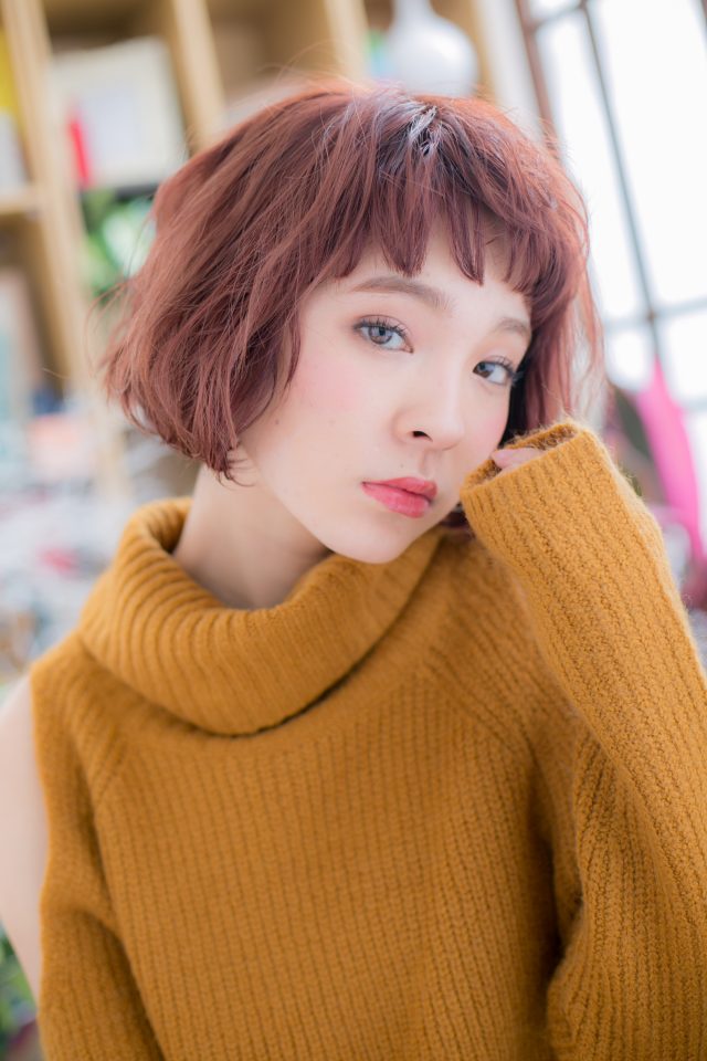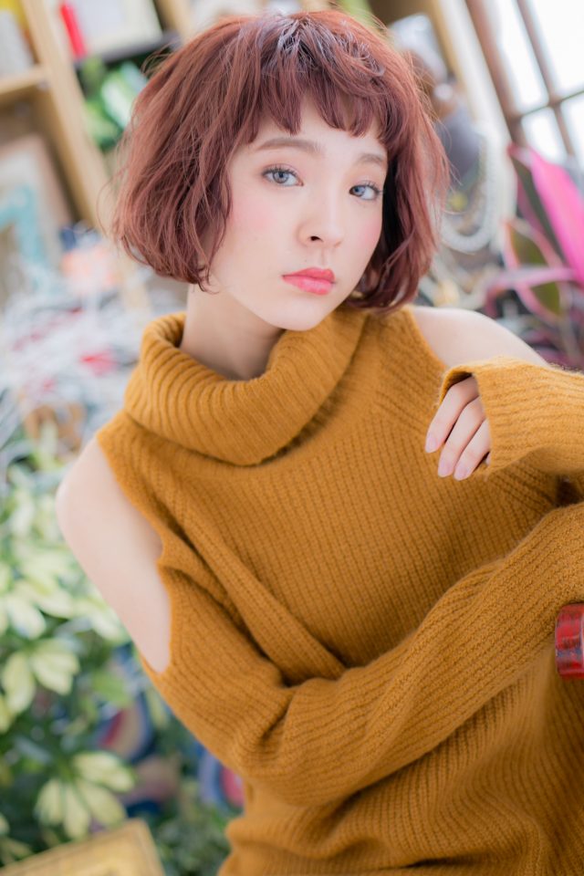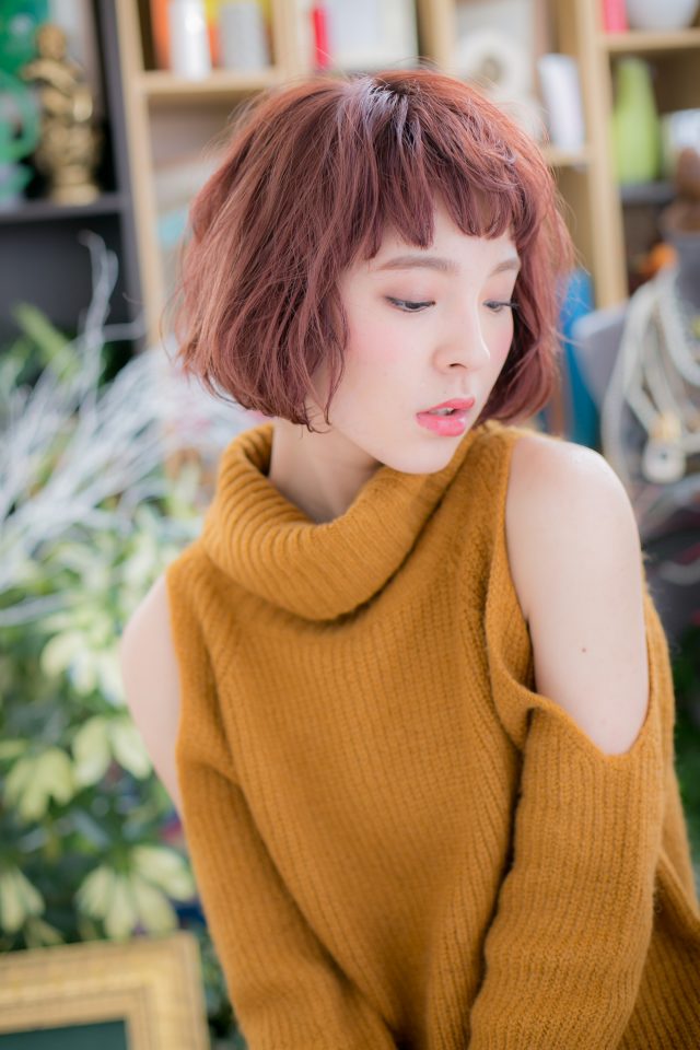 眉見せ斜めバング&厚めバングがちょっぴりレトロで大人かわいいフェミニンボブ。周囲と差のつくレッド系カラーで個性的に。ナチュラルボブや大人ボブ、前下がりボブからのイメチェンにオススメ!耳かけもキュート☆