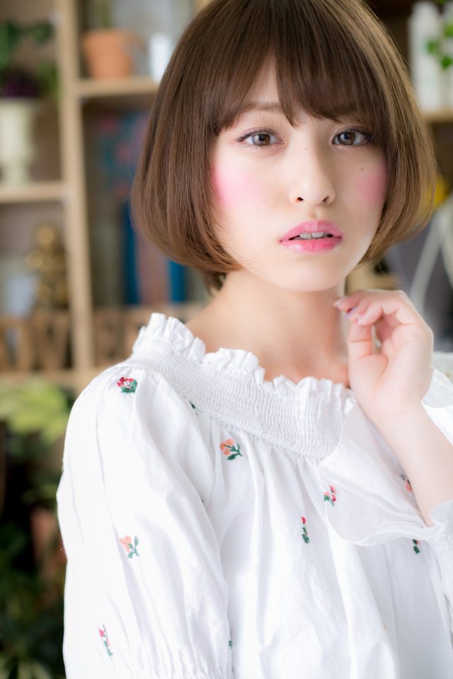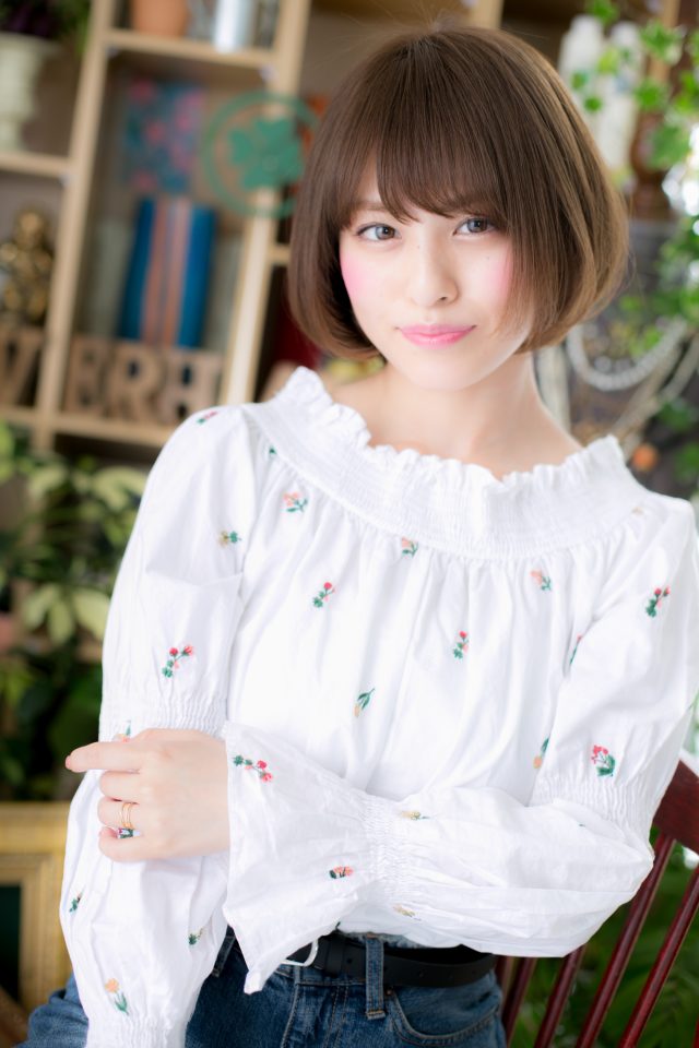 コロンとまとめたコンパクトフォルムで小頭に。スタイルUP効果を狙ったナチュラルボブ。前下がりで輪郭をカバーし小顔に見せます。 目の上ギリギリの斜めバングで目元を強調し目力UP!似合わせカットでとびきり可愛く★