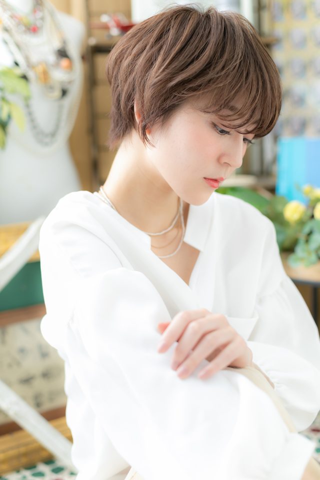 長めシースルーバングとレイヤーカットでニュアンス感ある動きを出した大人かわいいマッシュショート。トリートメントしたようなカラーリングで髪の毛の悩みも解決!30代・40代にも◎(メイク担当:北浦和店 棟方)