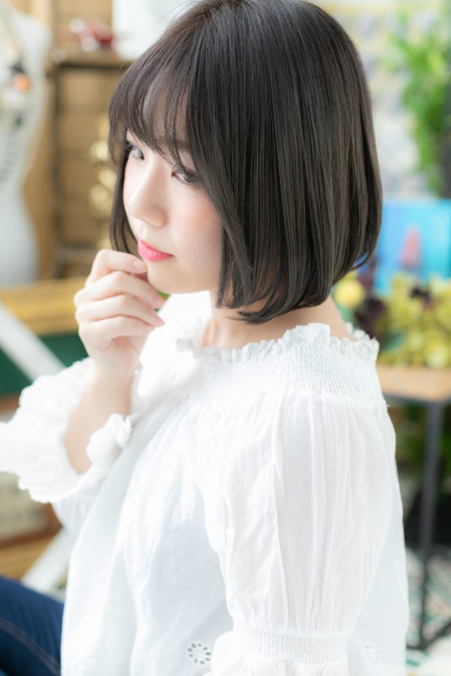 黒髪艶カラーが大人かわいい小顔前下がりボブ