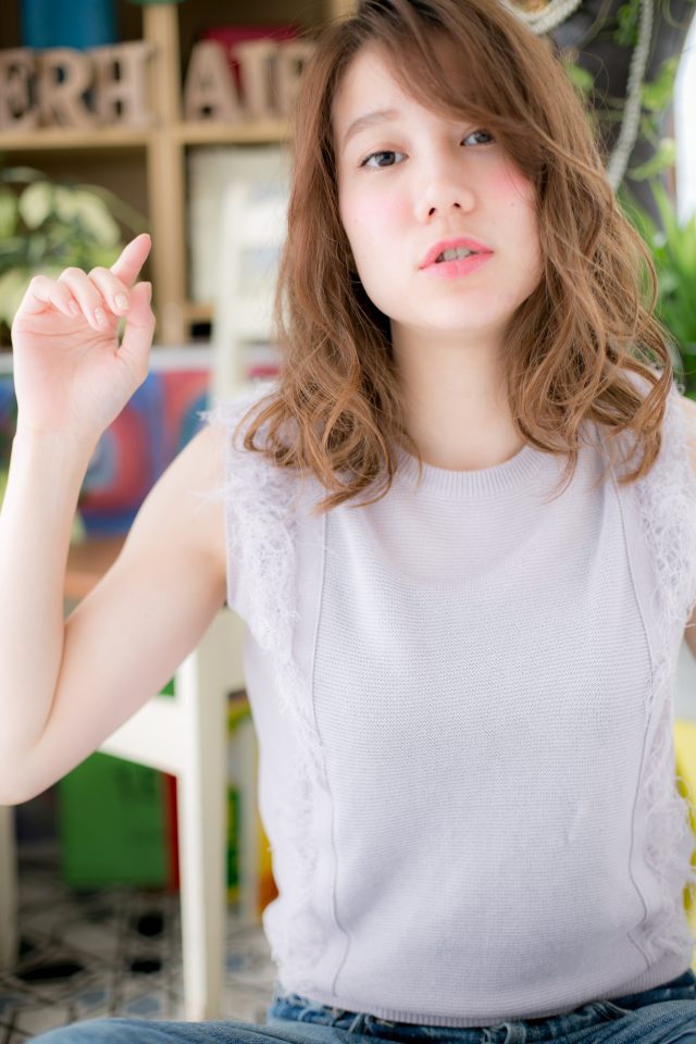 透け感ある斜めバングで表情をチラ見せした、色っぽかわいいふわミディ。厚めバングやワイドバングで個性的にしたり、耳かけも大人かわいい。くせ毛風カールのふわミディでモテ髪に♪(メイク担当:北浦和店 近藤)