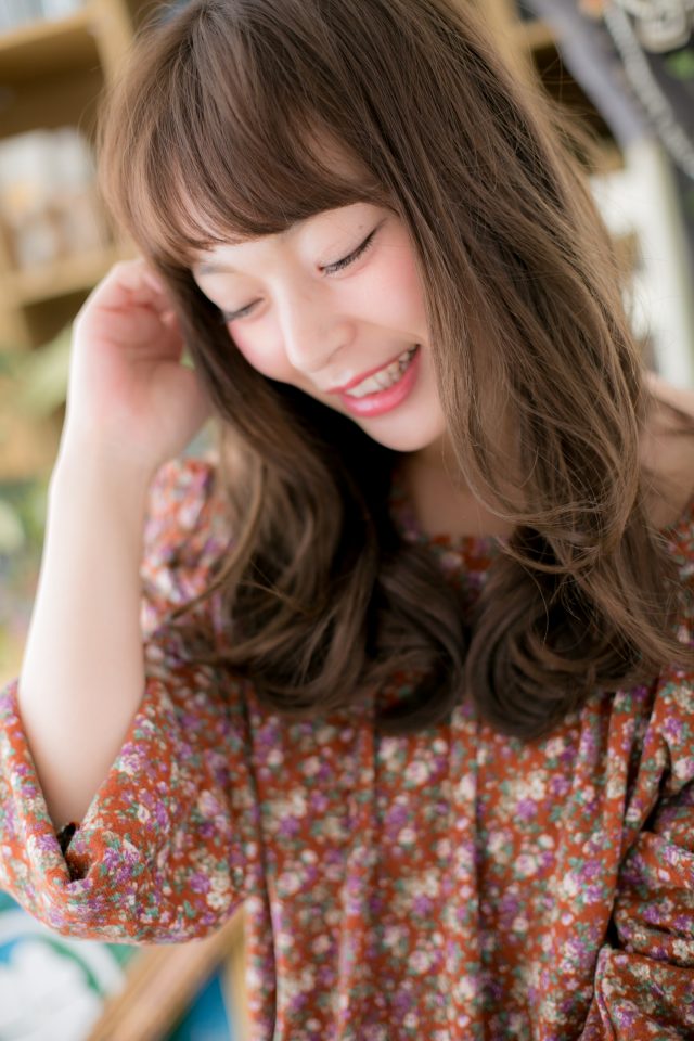 目元に印象を残す斜バングや厚めバングが大人かわいい♪愛されラブロング。くせ毛風カールと耳かけでガーリーにしたり、ワンサイドで抜け感を出してもOK。前下がりラインで小顔メイク♪(メイク担当:北浦和店 棟方)