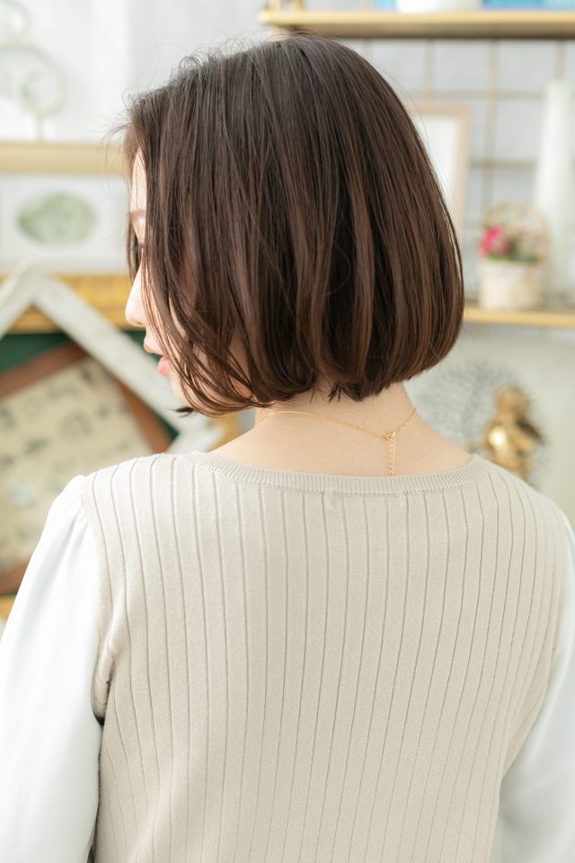 斜めバング厚めバング、かきあげ前髪シースルーバングも大人かわいい。ナチュラルボブフェミニンボブ、大人ボブ前下がりボブで小顔。くせ毛風ゆるふわミディや耳かけ前下がりウルフも人気。(メイク担当:川口店 岩淵)