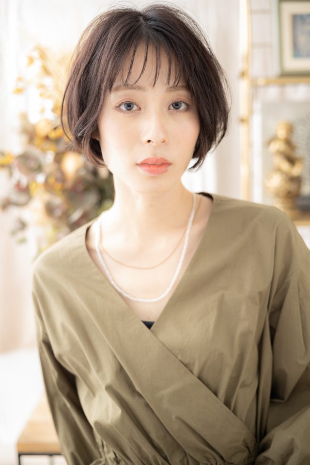 斜めバング厚めバング、シースルーバングかきあげ前髪で小顔。くせ毛風ゆるふわミディや韓国風耳かけ前下がりウルフも大人かわいい。大人ボブ前下がりボブ、切りっぱなしボブミニボブも人気。(メイク担当:川口店岩渕)