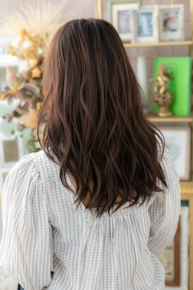 くせ毛風ゆるふわミディやエアリーミディからのイメチェンに◎耳かけアシンメトリー、前下がりや韓国風ウルフも大人かわいい。斜めバング厚めバング、シースルーバングかきあげ前髪で小顔。(メイク担当:川口店伊与田)