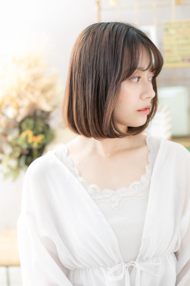 バレイヤージュやハイライトカラー、ミルクティーアッシュで外国人風。切りっぱなしボブミニボブ、ナチュラルボブフェミニンボブも人気。くせ毛風ゆるふわミディや耳かけウルフも大人かわいい。(メイク担当:川口店岩渕)