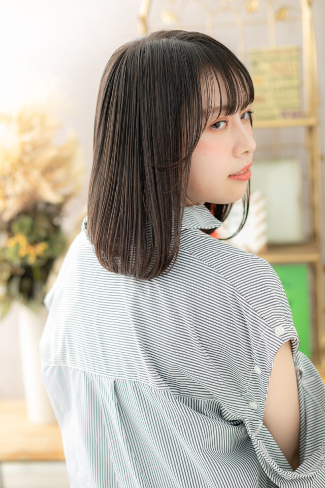 くすみカラーやバレイヤージュ、ハイライトカラーが大人かわいい。斜めバング厚めバング、シースルーバングかきあげ前髪で小顔。くせ毛風ゆるふわミディやエアリーミディ、前下がりウルフも◎(メイク担当:川口店伊与田)
