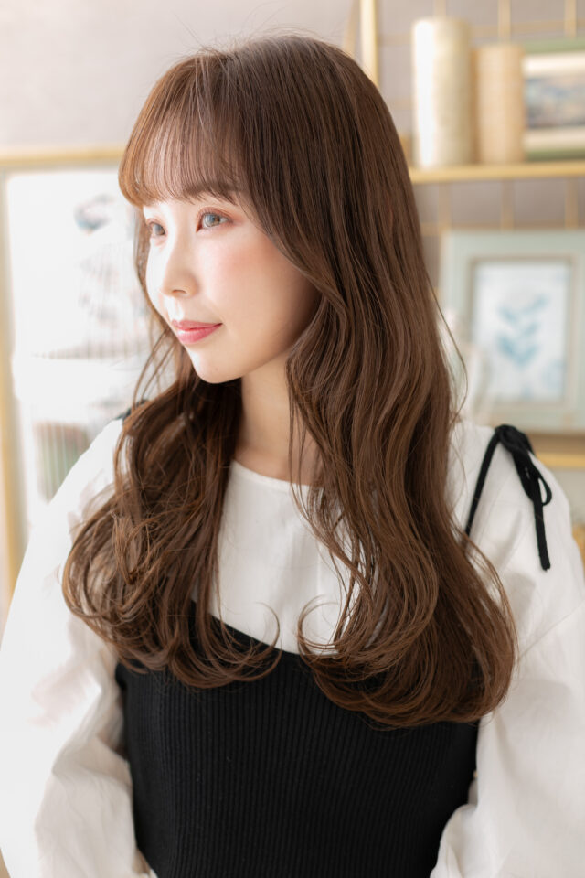 くびれ感のあるS字カールが大人かわいい外国人風エアリーロング。ラウンドバングや斜めバング、前髪パーマや透けバングも人気。前下がりや耳かけ、無造作なかきあげヘアアレンジで小顔に。(メイク担当:川口店伊与田)