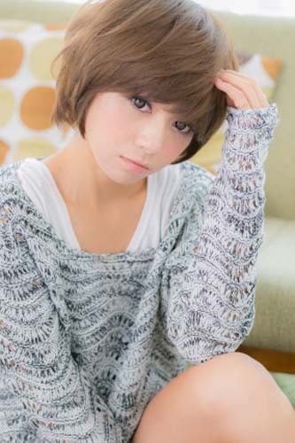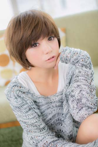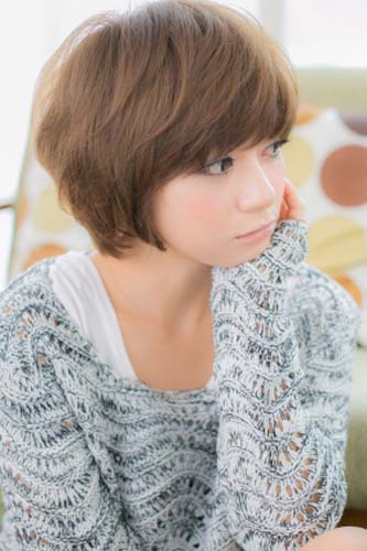 柔かい甘さを秘めたマッシュショート。女の子らしい毛流れで目の上ギリギリのバングは小顔効果と可愛らしさがグンとUP! 。大人かわいいラブリィショート,厚めバング,ラウンドバング,前下がり,カジュアルショート,透明感のあるオレンジベージュもオススメ★