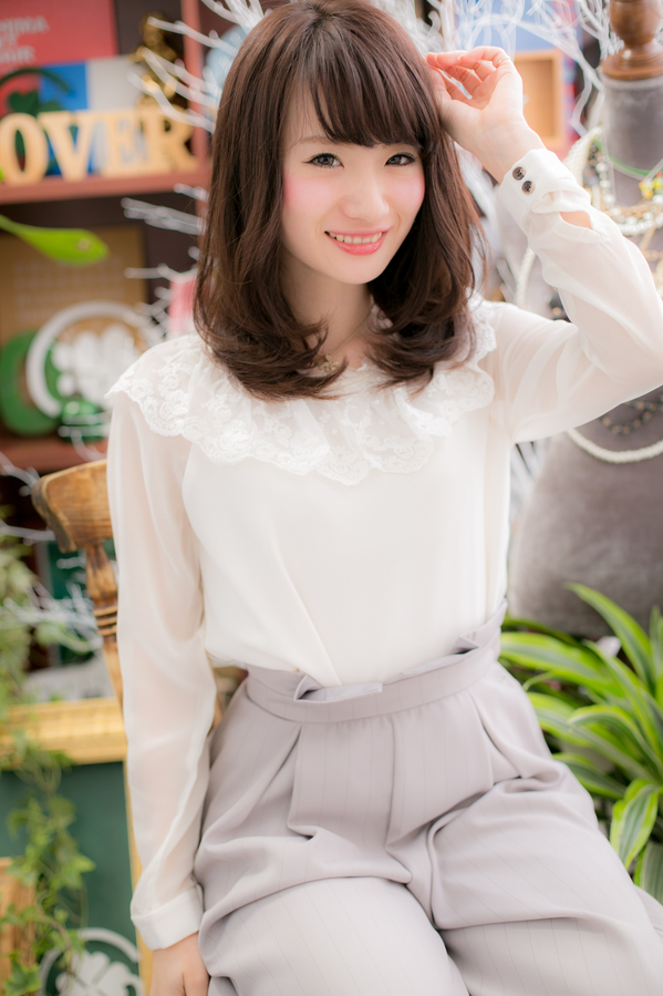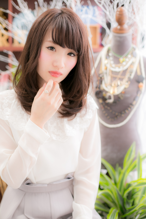 眉ぎりぎりの前髪がポイント★目元を印象付けるだけでなく、トップ~サイドの顔を包み込むことで、可憐な印象にしてくれます♪毛先のカールが柔らかさを出します。