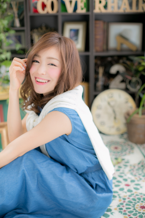 長めの前髪とフェミニンなウェーブで、デキる大人女子な印象にも見せてくれるミディアムスタイルです。明るいベージュカラーが透明感ある印象に。