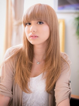 ハイトーンなので、重めバングもナチュラルに可愛い!全体にストレート、毛先には軽くカールを付けてしまうから湿気にも負けない優秀スタイル。とにかく、手がかからずにおすすめです!サラサラkeepには毛髪改善ケアトリートメントがオススメ!