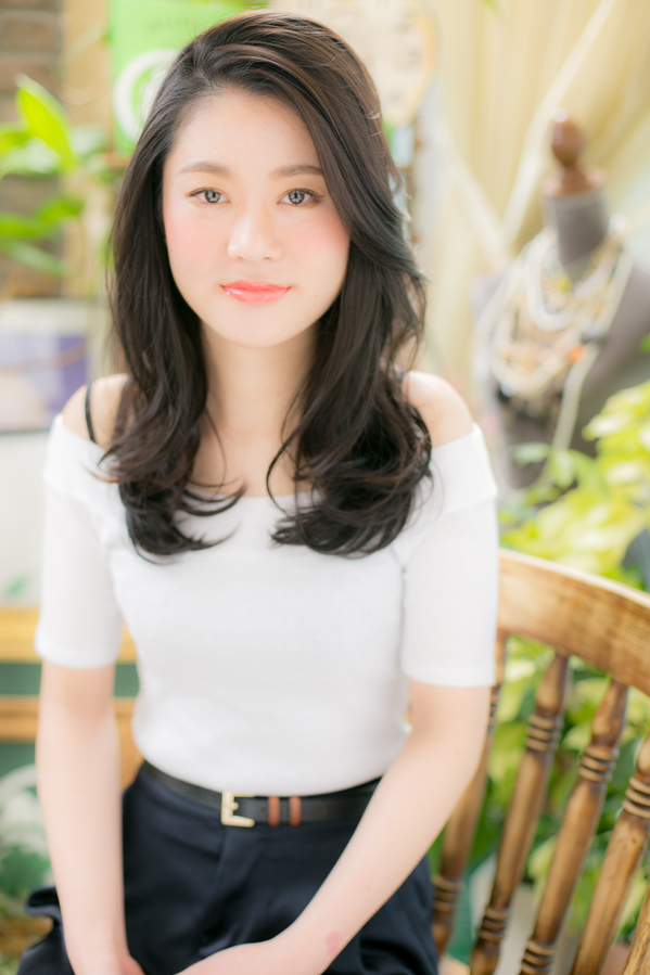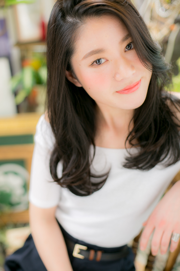 かきあげバングで大人ナチュラル。ゆる巻きウェーブで柔らかい動きを出したレイヤースタイル。風が吹いて崩れた感じがエアリーに決まる、直しいらずのロングスタイル。