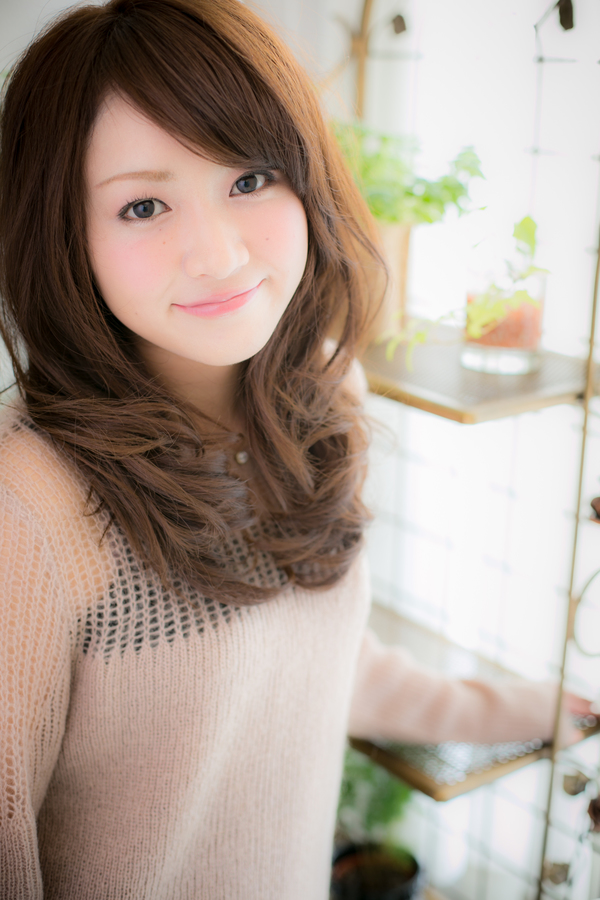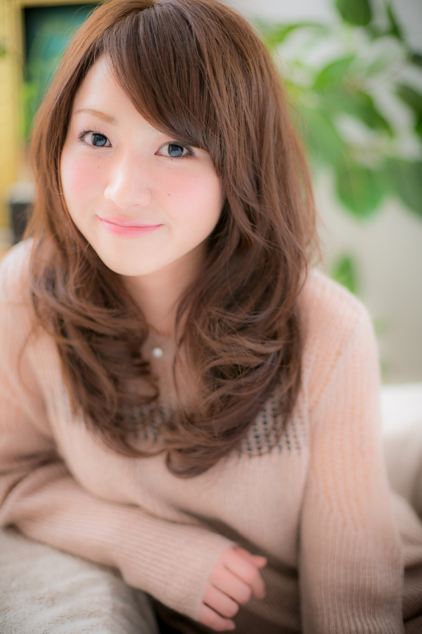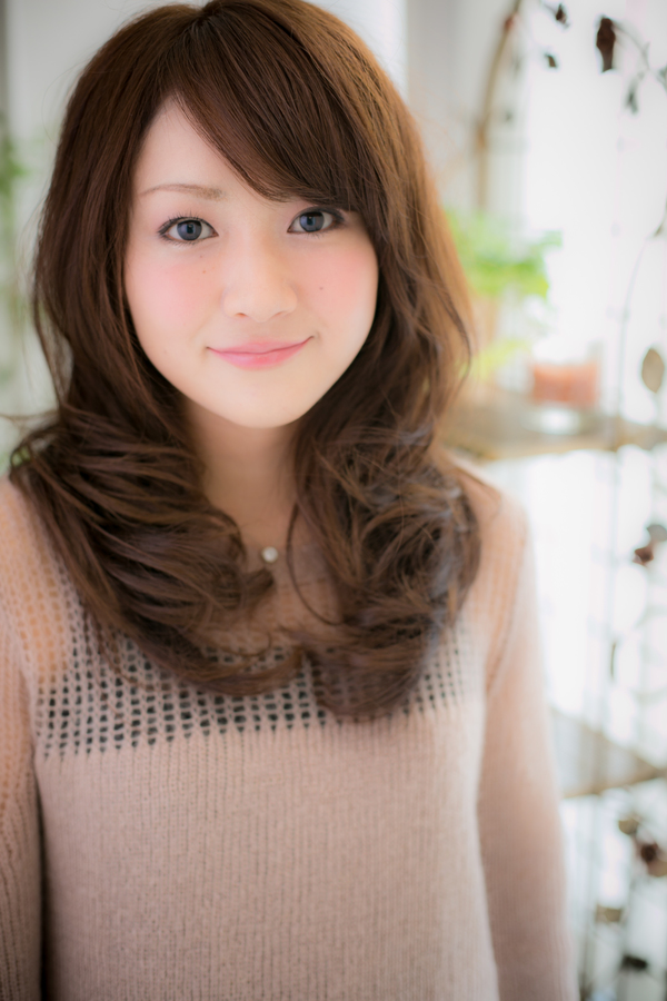 ゆるやかなナチュラルウェーブで大人カワイイパーマスタイルに!イエロー系ブラウンでやわらかな優しい雰囲気を演出。前髪を流すことで、会社でも好感度の高い愛されフェミニン髪に♪
