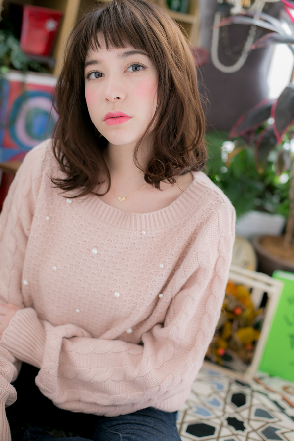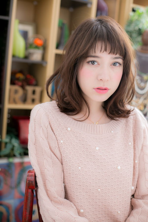 ラインの出る個性的な短めバングに重く見えない透け感が可愛い前髪と、ゆるふわウェーブがポイント☆子どもっぽくなり過ぎないよう、深みあるダークトーンで落ち着いた印象に。