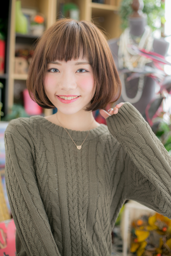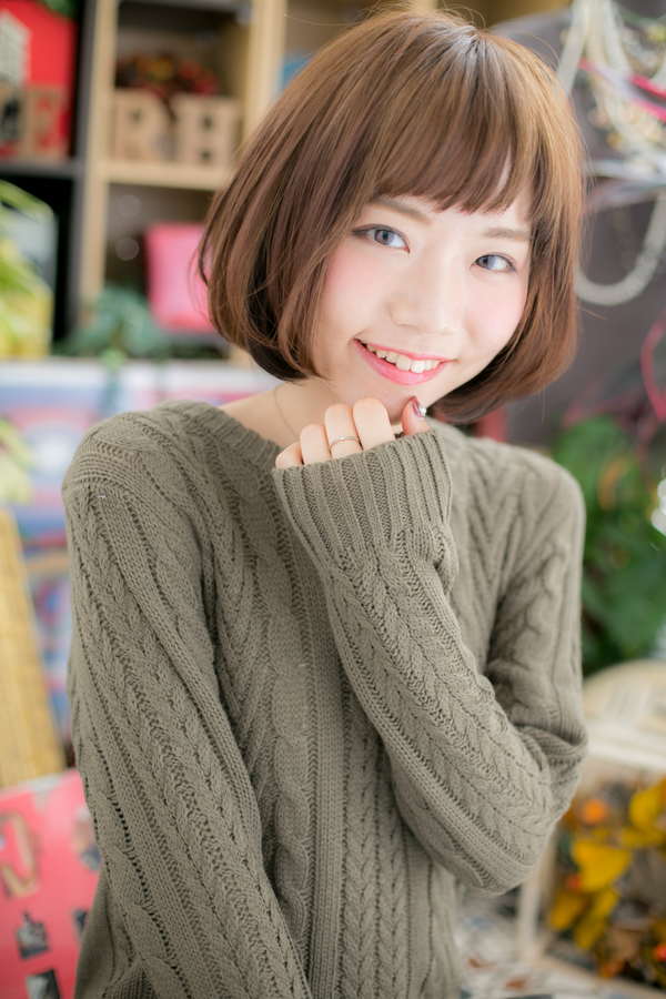 小顔だけでなく、目元を強調して目力UP効果も狙っているので、甘えた表情が似合う妹系の可愛らしい雰囲気に。シンプルになりがちなナチュラルなボブにアクセントカラーをプラスでオシャレ度UP!