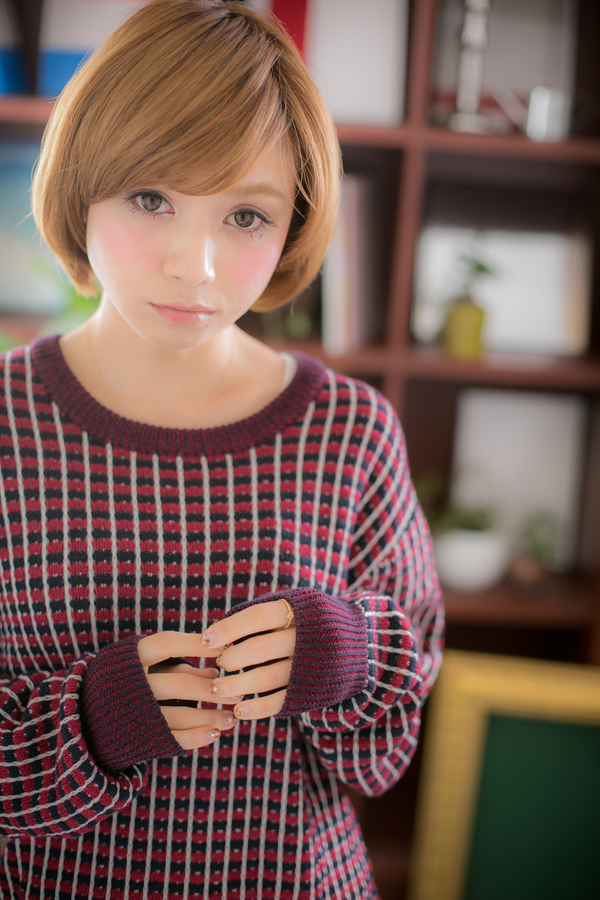 シンプルだけど可愛い!丸みシルエットがポイントのハイトーンナチュラルボブ★透きとおるヌーディカラーは髪質も柔らかくみせます。ラブな斜めバングが大人かわいくも♪耳かけしたり,バングをアレンジして印象も変えて楽しんで!黒髪もグラマラスな雰囲気に