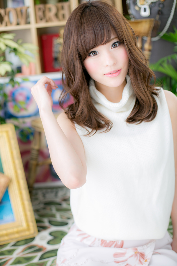 透け感ある斜めバングと耳横からリズミカルになびくエアリーカールで、ゆらぎ感あるモテ髪に。目元を強調して目力UPそ、サイドの毛流れで小顔見せもバッチリ。姫カットや耳かけでアクセントをつけても個性的でカワイイ♪