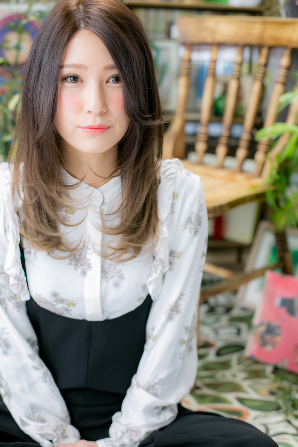 顔周りを包み込むサイドの毛流れで輪郭をカバー。頬をスッキリと小顔に見せます。肩下で揺らめくグラデーションカラーとレイヤーで、内巻きワンカールもグラマラスに!