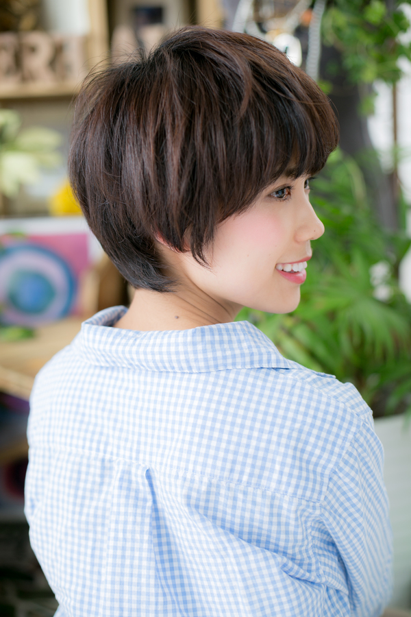 トップからおろした厚めバングで目元を強調して目力UP!笑顔の似合うラブショートは、男女問わず人気の好感スタイル。ショート初挑戦の方にもオススメです。毛先を外ハネさせて、軽やかに弾むスイングショートもGOOD!ヒアルロン酸カラーは白髪にも対応可。