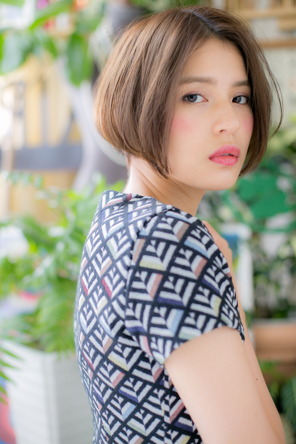 前下がりラインで輪郭をカバーした小顔見せナチュラルボブ。センターパートでクールにしたり、斜めバングや厚めバングでフェミニンな雰囲気にしてもOK。くせ毛風カールをつけたフェミニンボブや大人ボブもGOOD!