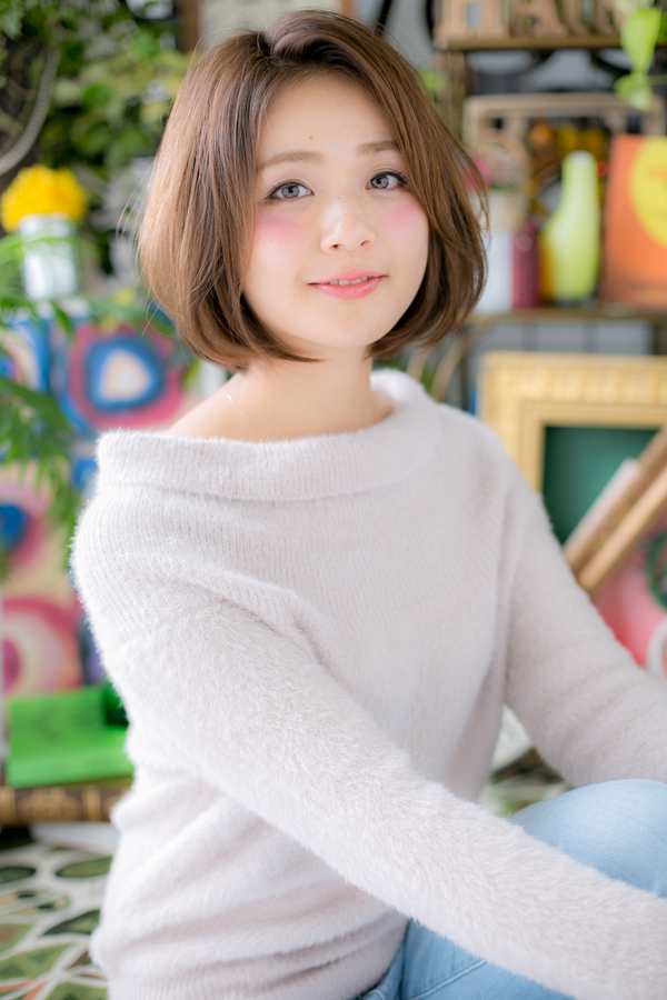 ノーバング&前下がりでスッキリ小顔に見せたナチュラルボブ。くせ毛風カールのフェミニンボブや大人ボブにヘアアレンジしやすい。大人女子のファションにもおすすめ!ミディアムヘアを際立たせるグラデーションカラーで髪の毛の悩みも解消。30代・40代にもおすすめ(メイク担当:北浦和店 近藤)