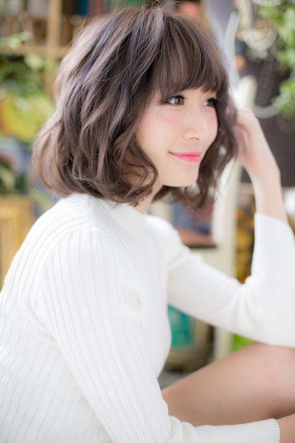 くせ毛風ランダムカールでボリュームを持たせて小顔見せなヘアスタイル。斜めバング&厚めバングで目力強調して大人女子のコーデを完成!。大人かわいいが詰まったラブふわミディは、耳かけしたりラフな抜け感ヘアアレンジもGOOD。ミディアムヘアを際立たせるグラデーションで人気のカラーもおすすめ!ピンク系のからーも◎(メイク担当:川口店 成田)