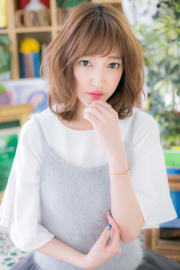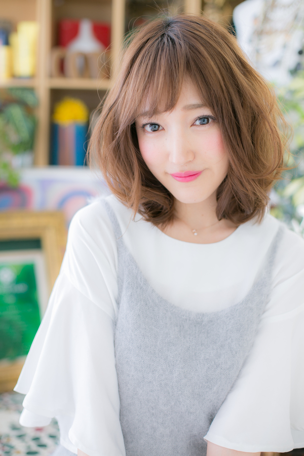 やわらかな空気感を醸す大人かわいいふわミディなヘアスタイル。斜めバングで目力UP。厚めバングやオン眉も個性的で大人女子のファション度UP。くせ毛風カールや耳かけで抜け感を出してもヘアアレンジもおすすめ!ミディアムヘアを際立たせるグラデーションでトリートメントしたようなカラーリングで髪の毛の悩みも解決!30代・40代にもおすすめ!(メイク担当:北浦和店 棟方)