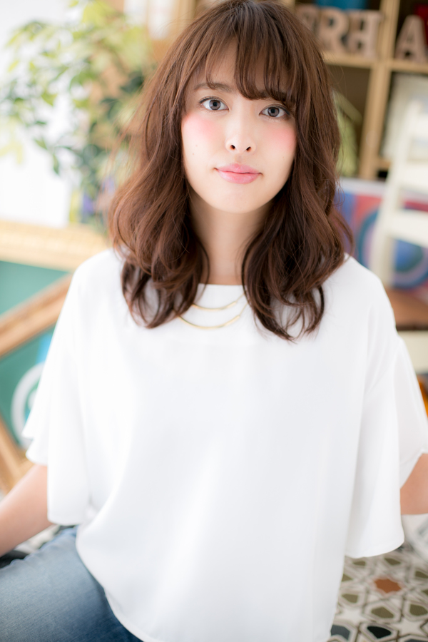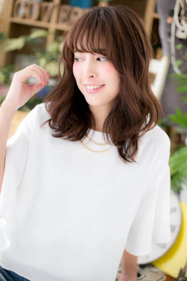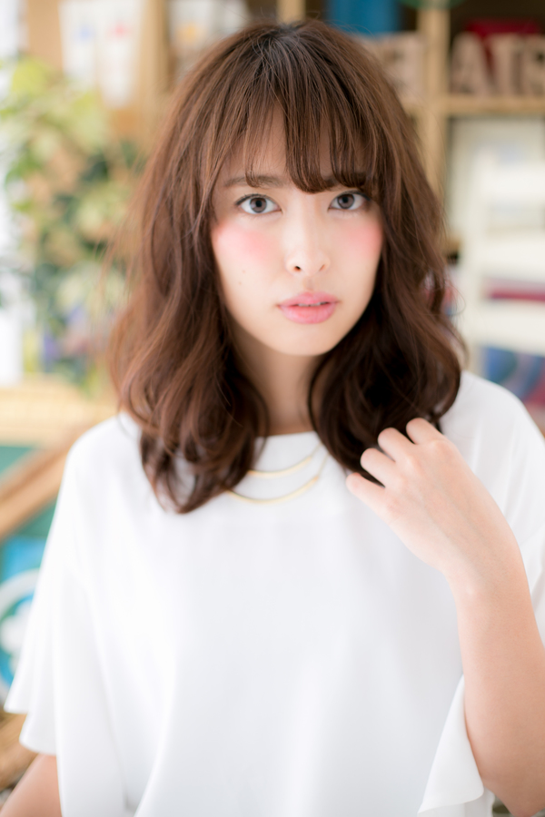 Aラインシルエットで小顔に見せたくせ毛風パーマのふわミディ。暗髪の重めスタイルでも、透け感ある斜めバングで空気感と軽さを出して重軽MIXにヘアアレンジして前下がりや耳かけも大人かわいい♪トリートメントしたようなカラーリングで髪の毛の悩みも解決!30代・40にもおすすす☆(メイク担当:北浦和店 棟方)