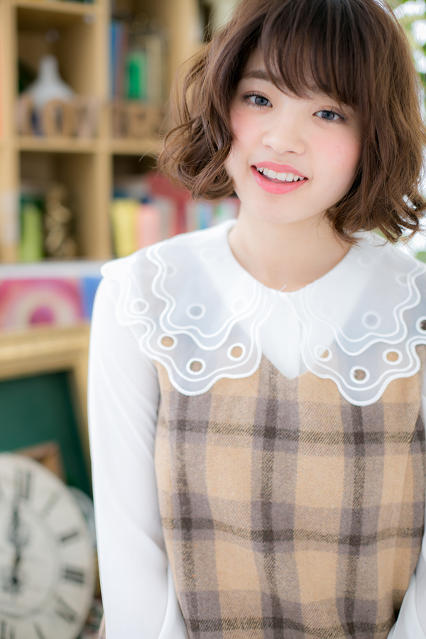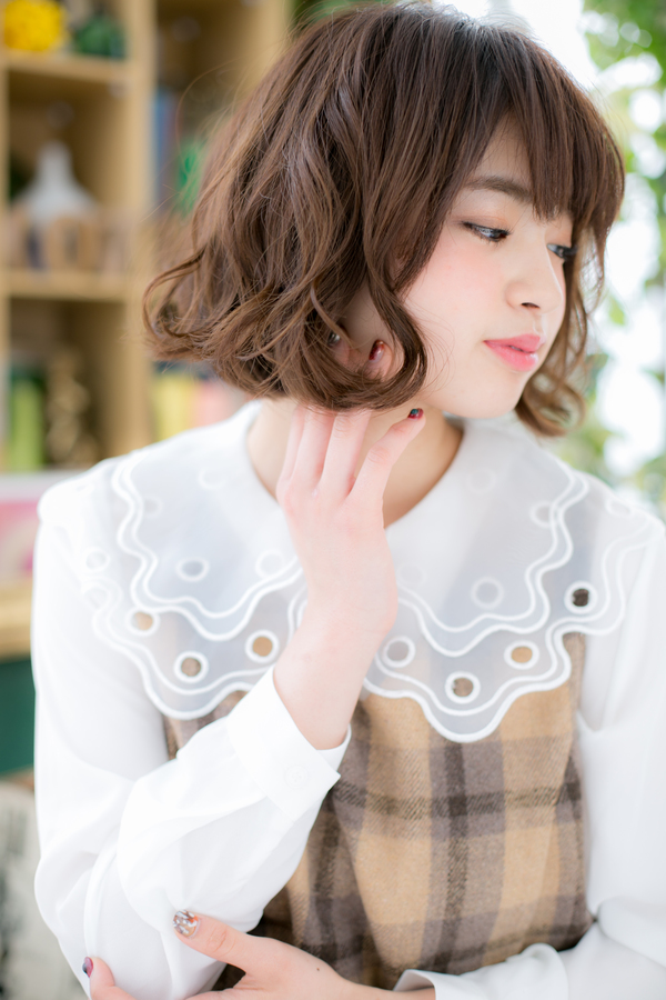 斜めバング&くせ毛風パーマが大人かわいいフェミニンボブのヘアスタイル!。ナチュラルボブや大人ボブ、前下がりボブからのヘアアレンジにピッタリ。暗髪で旬顔で大人女子のファション度UP。ミディアムヘアを際立たせるグラデーションでトリートメントしたようなカラーリングで髪の毛の悩みも解決!人気のカラーやピンク系のカラーも◎30代・40にもおすすめ☆(メイク担当:北浦和店 棟方)