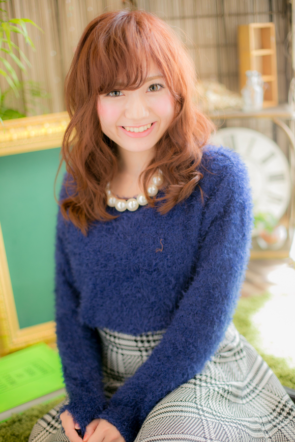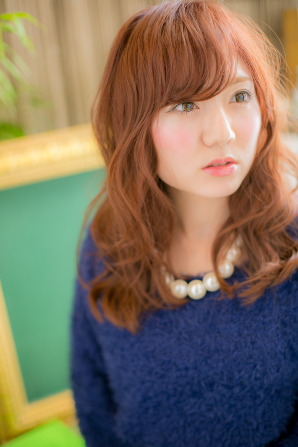 程よいボリュームのエアリーカールと明るめハッピーカラーで、モテオーラ全開の大人グラマラススタイルに☆顔周りのレイヤーと斜めバングで小顔効果も。厚めバングや耳かけもGOOD。簡単ヘアアレンジでパーティや二次会でもOK。無造作なくせ毛風スタイルも◎