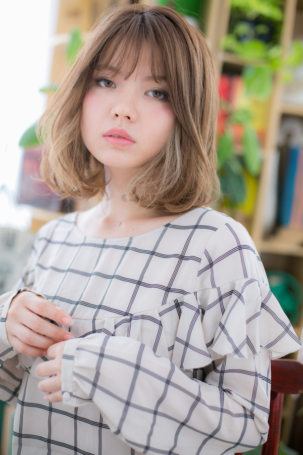 パッと目を引くハイトーンのグラデーションカラーで友達をリード!くせ毛風パーマとシースルーバングがフェミニンなふわミディ。前下がりで輪郭カバーして小顔見せで大人女子のファッション度UP。トリートメントしたようなカラーリングで髪の毛の悩みも解決!人気のカラーやピンク系のカラーもおすすめ!30代・40代にも◎(メイク担当:川口店 成田)